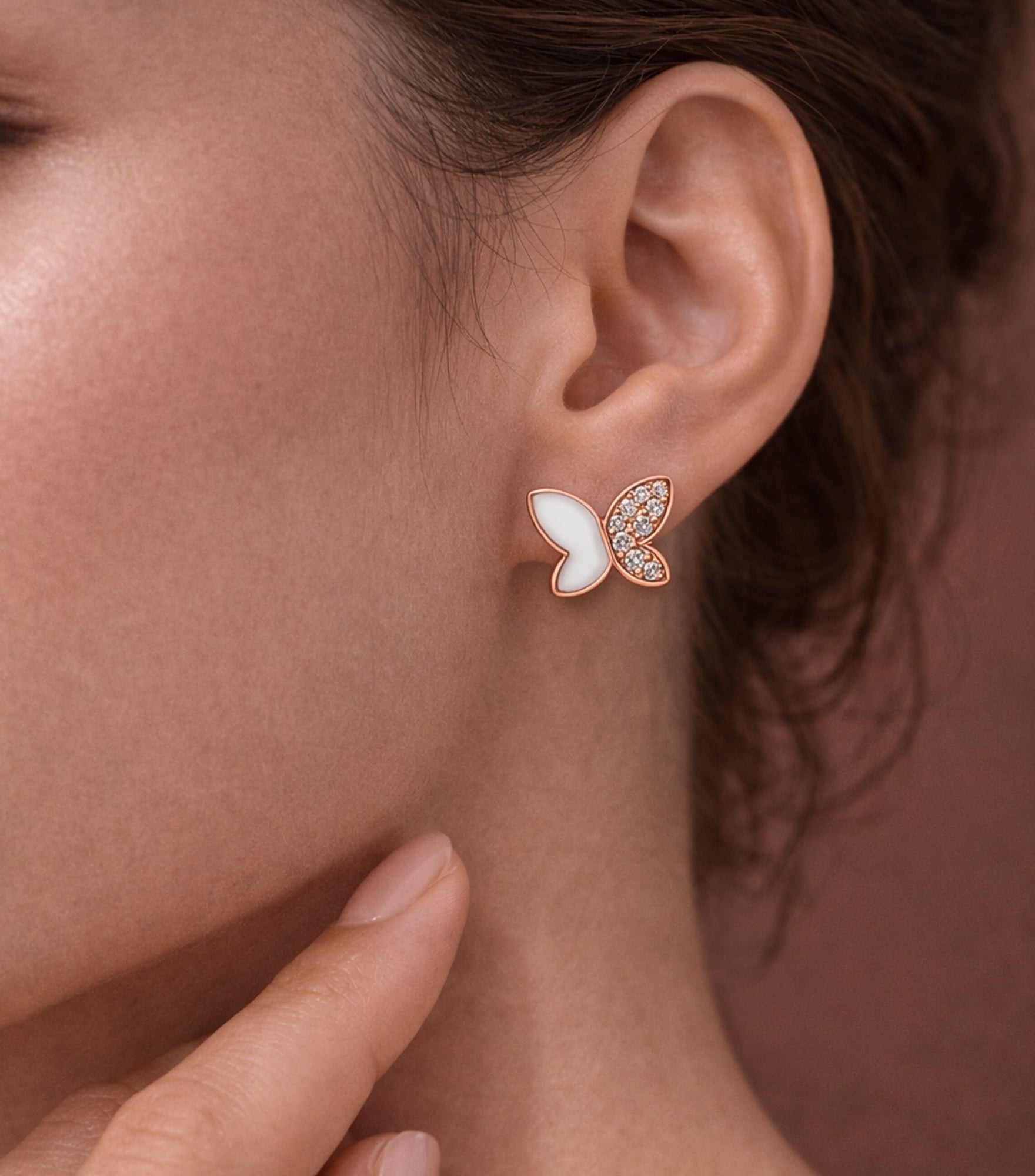 Designed with delicate precision, these rose gold butterfly stud earrings feature crystal-studded upper wings paired with a smooth, polished lower wing silhouette. The balanced contrast between sparkle and minimal metalwork creates a refined yet modern look.